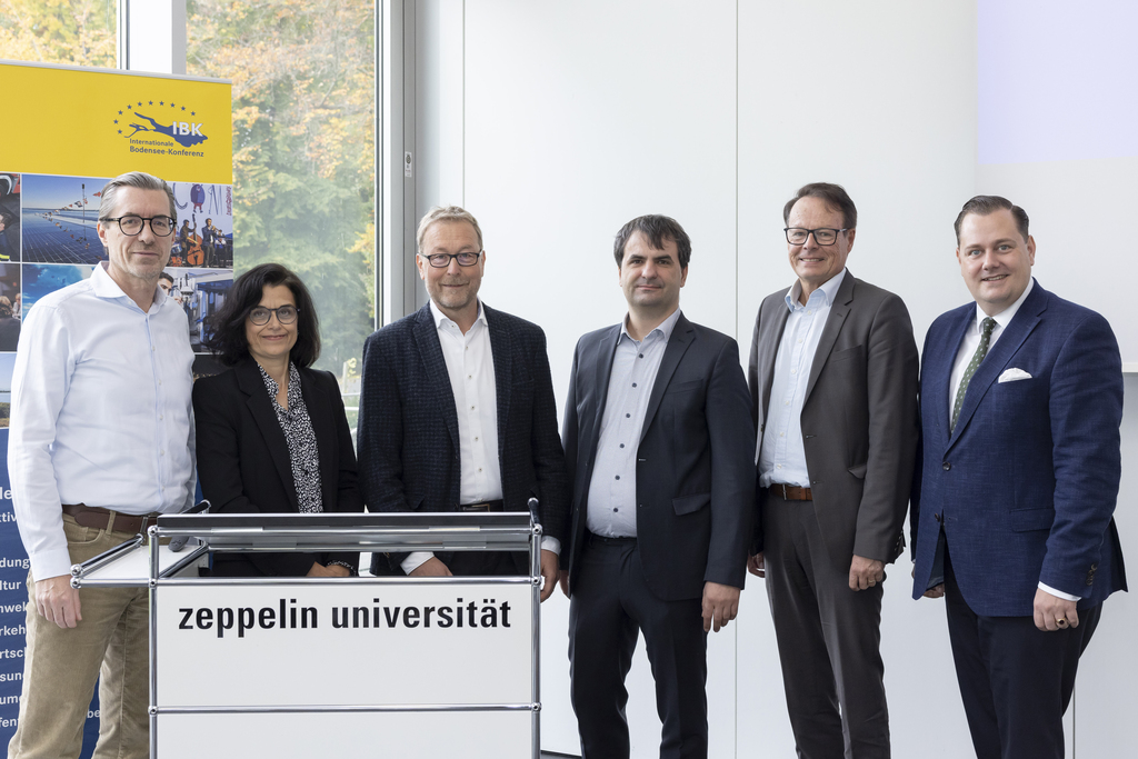 Modul III am 20. Oktober 2025 in Friedrichshafen: Die Referierenden mit Regierungspräsident Klaus Tappeser, dem Geschäftsführer der IBK Geschäftsstelle Klaus-Dieter Schnell sowie dem Liechtensteinischen Regierungssekretär Michael Hasler.